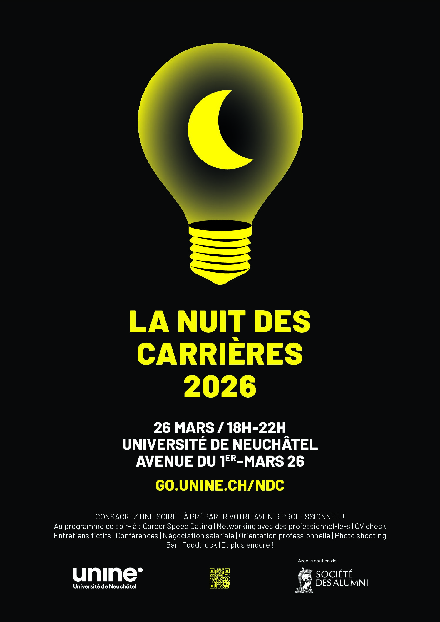 Organisée tous les deux ans, La Nuit des Carrières est une soirée qui a pour but de vous présenter différents types de carrières, de vous donner des conseils pour entrer sur le marché du travail, de vous aider à mettre en valeur vos compétences et enrichir votre réseau, le tout à travers des activités et des présentations originales et ludiques.