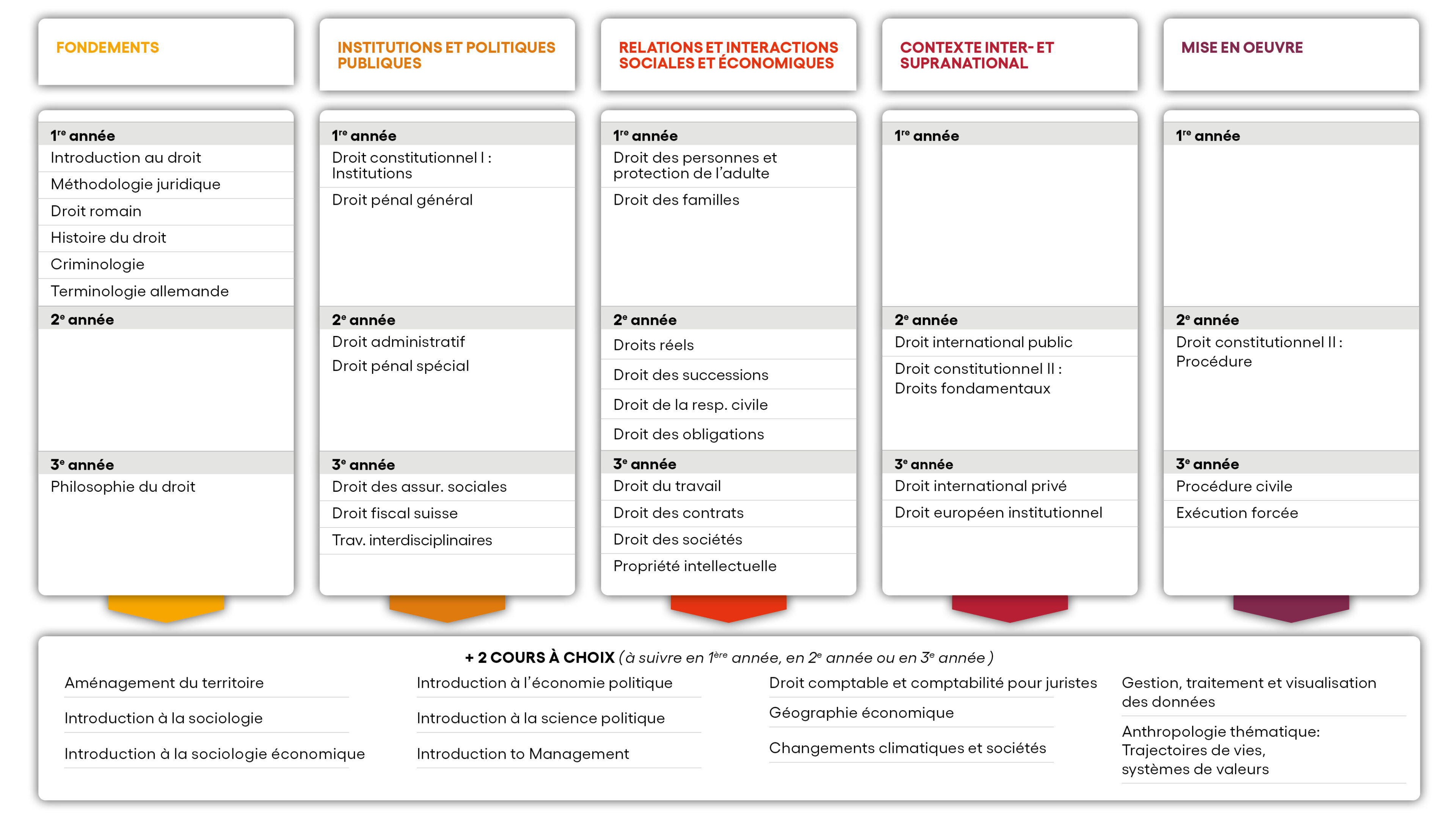 Le plan d'études du Bachelor of Law présente une offre de cours très variée et repose sur les grands piliers du droit que sont les institutions et politiques publiques, les relations et interactions sociales et économiques, le contexte international et supranational, les procédures de mise en œuvre ainsi que les fondements du droit et les outils méthodologiques propres aux juristes.
