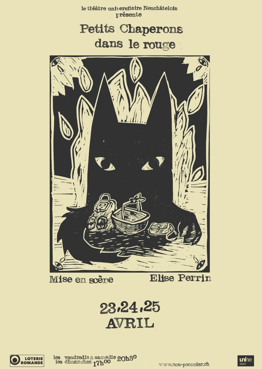 Publicitaire, érotique, clownesque ou vénère : le Petit Chaperon comme vous ne l’avez jamais vu. Le prédateur n’est pas en reste, ça c’est un peu moins marrant, mais comme on a dit, la culture c’est pas que du divertissement. Et puis c’est pas un scoop : un conte, ça n’a rien d’innocent. Cette année, nous avons choisi Elise Perrin à la mise en scène.
