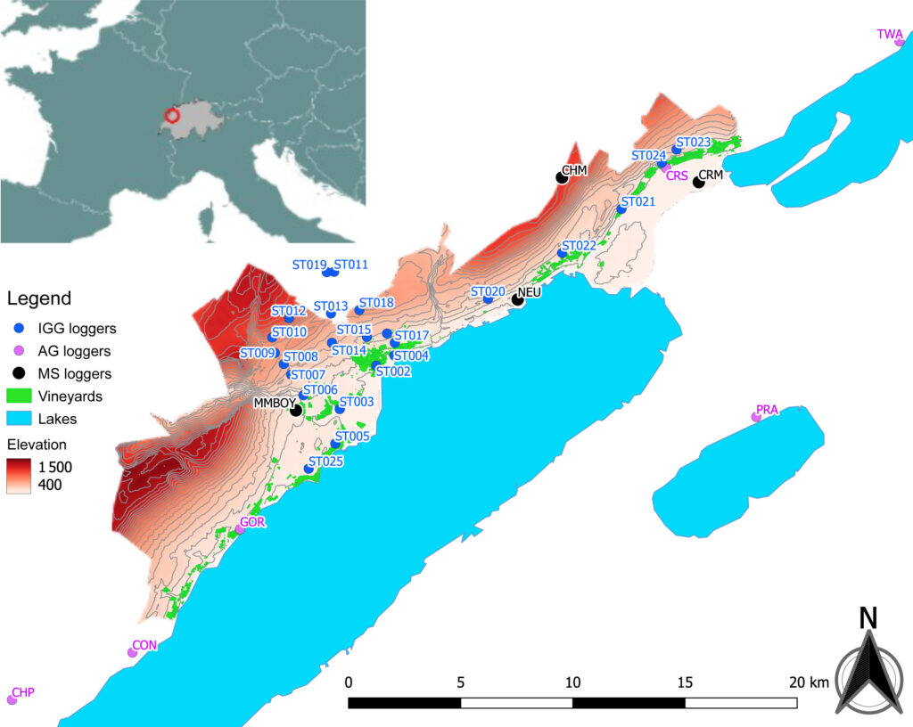 Le vignoble neuchâtelois s’étend le long du littoral sur environ 600 hectares, et est composé majoritairement de Pinot noir (55%) et de Chasselas (27%). Dans le cadre de l’étude, 25 capteurs de température ont été placés dans le vignoble et au-dessus, afin de modéliser le climat local de façon précise.
