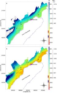 Évolution de l’indice héliothermique de Huglin sur le littoral neuchâtelois entre (a) les années 1970 et (b) les années 2010.