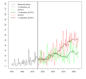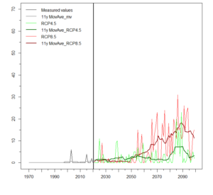 Évolution du nombre de jours avec une température maximale au-dessus de 30°C (haut) et au-dessus de 35°C (bas) à la station MétéoSuisse de Neuchâtel entre 1970 et 2100. Pour la période 2021-2100, un scénario d’émissions modérées de gaz à effet de serre est présenté en vert (RCP4.5) et un scénario d’émissions élevées de gaz à effet de serre est présenté en rouge (RCP8.5).