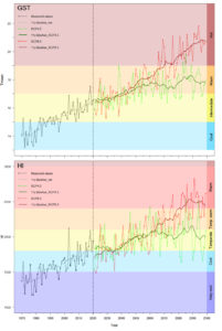 Évolution de la température moyenne pendant la période végétative (GST) et l’indice de Huglin (HI) à la station MétéoSuisse de Neuchâtel entre 1970 et 2100. Pour la période 2021-2100, un scénario d’émissions modérées de gaz à effet de serre est présenté en vert (RCP4.5) et un scénario d’émissions élevées de gaz à effet de serre est présenté en rouge (RCP8.5).