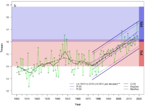 Évolution de la température moyenne pendant la période végétative (avril-octobre) à la station MétéoSuisse de Neuchâtel, 1900-2020. Les conditions idéales pour le Pinot noir (PN) sont indiquées en rouge, et pour le Merlot (MN) en violet.
